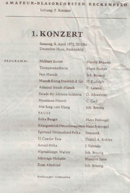 Dirigent Ferdinand Kreimer eröffnete das Konzert mit „Military-Escort“ von Harold Bennet. In der weiteren Besetzung schallte es aus zwei Flügelhörnern, zwei Eshörnern, einer Zugposaune sowie einem Bariton, einem Alt- und einem Tenorhorn. Relativ neue Komponenten erfuhr das Publikum durch den Einsatz von Schlagzeug und dem ersten Saxophon – und einem Tenorsaxophon. Dieses wurde von der ersten Dame des Vereins, Ursula Kreimer, gespielt. Das Programmheft bot den Zuhörern im weiteren Verlauf alles von Polka über Walzer bis zum Volkstümlichen.